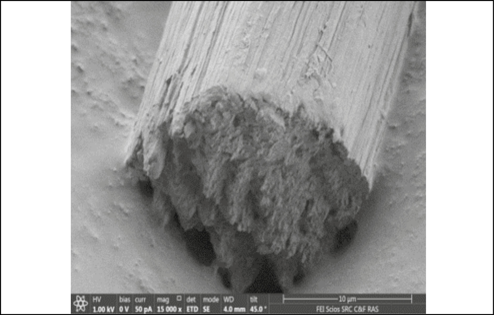 В отличие от целлюлозных волокон Лиоцелл или Орцел, в которых высокая продольная ориентация как кристаллитов, так и аморфных участков способствует формированию фибрилл размером, не превышающим 0.08–0.1 мкм, со столь плотной упаковкой, что они не проявляются на поперечных срезах волокон, полученные композитные волокна характеризуются более крупной гетерогенной слоистой текстурой, сформированной скорее микроволокнами размером порядка 1 мкм, а не фибриллами. Микроволокна также гетерогенны и состоят из множества ориентированных, фибриллярных субъединиц. Поверхность волокна бороздчатая из-за выступающих на поверхность микроволокон, а поперечное сечение, в целом, круглое. Трудно однозначно утверждать о фазовых составах образующихся структур, но выделенные после удаления ПАН фибриллы целлюлозы, во-первых, подтверждают электронно-донорно- акцепторную (ЭДА)-природу межмакромолекулярных связей, во-вторых, сохранение их прочностных свойств на достаточно высоком уровне подтверждают достоверность высказанного ранее механизма, согласно которому макромолекулы ПАН взаимодействуют с поверхностными функциональными группами целлюлозных структурных агрегатов.