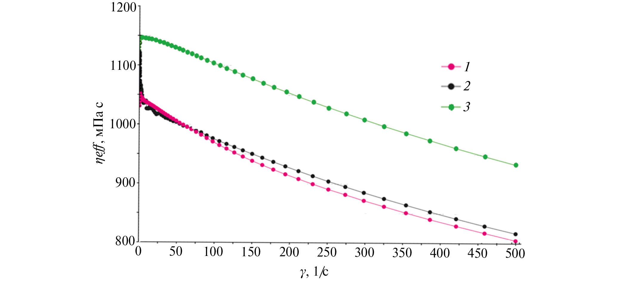 Рис. 1. Зависимость эффективной вязкости ηeff от градиента скорости сдвигового поля γ в полулогарифмических координатах: 1 – ПАН, 2 – ПАН–графит (95 : 5), 3 – ПАН–графит (50 : 50) в ДМФА. Цветные рисунки можно посмотреть в электронной версии.