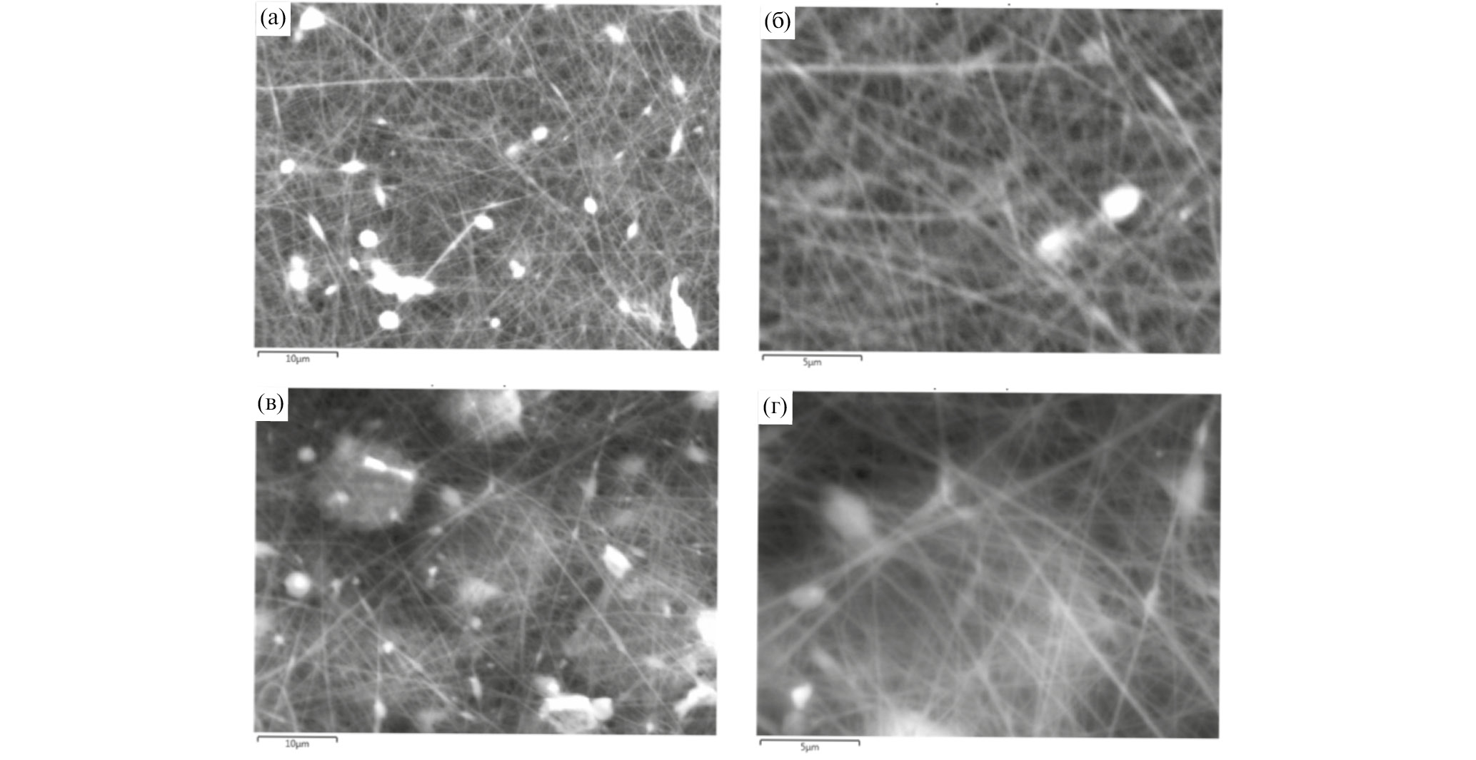Рис. 3. Электронно-микроскопические снимки композиций нановолокон ПАН с графитом в соотношении 95 : 5 (а, б) и 50 : 50 (в, г).