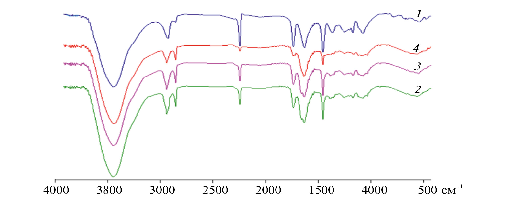 Рис. 4. ИК-спектры образцов ПАН и его композиции с графитом: 1 – исходный ПАН; 2 – нановолокна ПАН; 3, 4 – нановолокна из композиции ПАН : графит = 95 : 5 (3) и 50 : 50 (4).