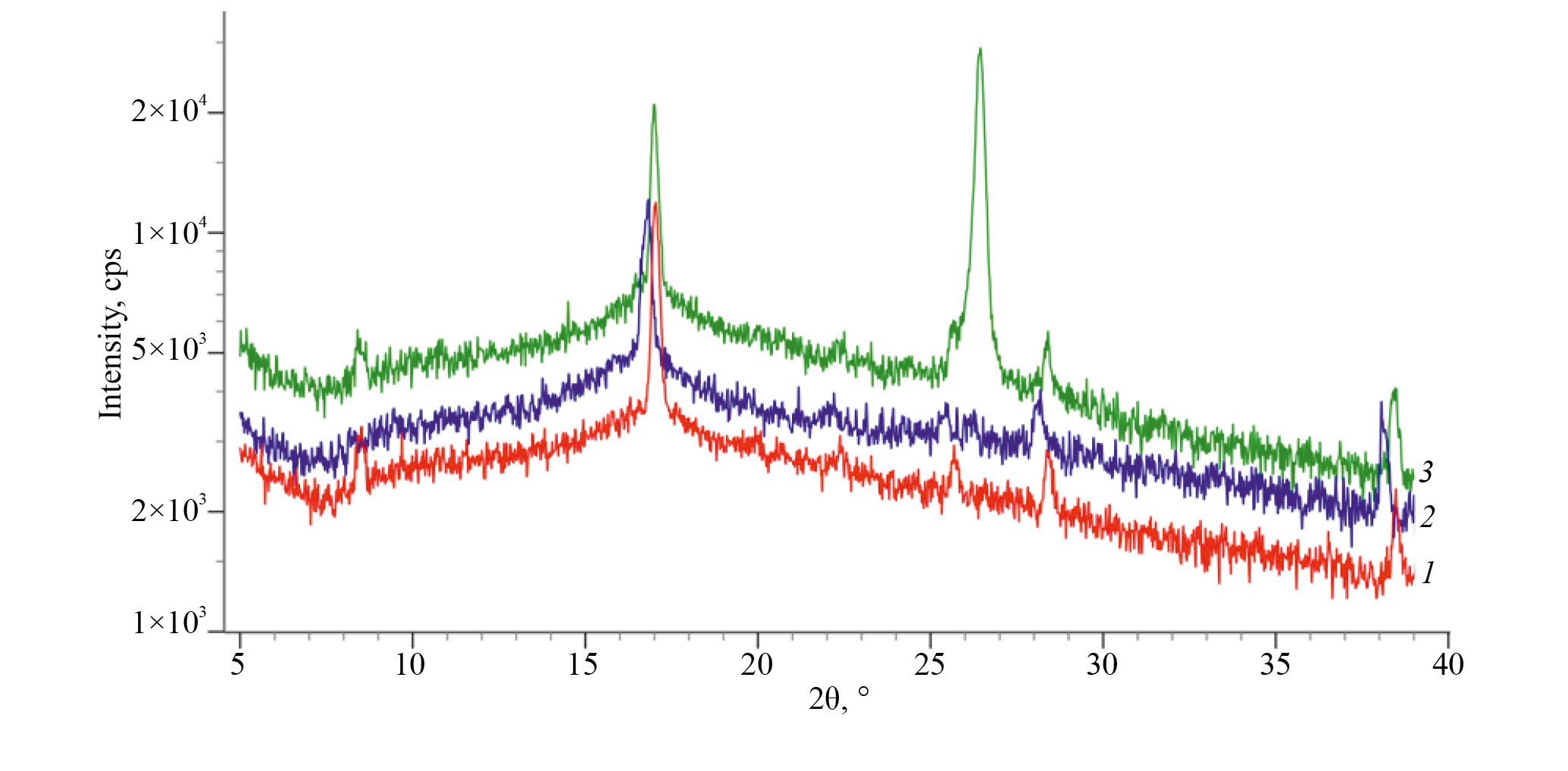 Рис. 5. Дифрактограммы образцов ПАН и его композиции с графитом: 1 – нановолокна ПАН; 2, 3 – нановолокна из композиции ПАН : графит = 95 : 5 (2) и 50 : 50 (3).