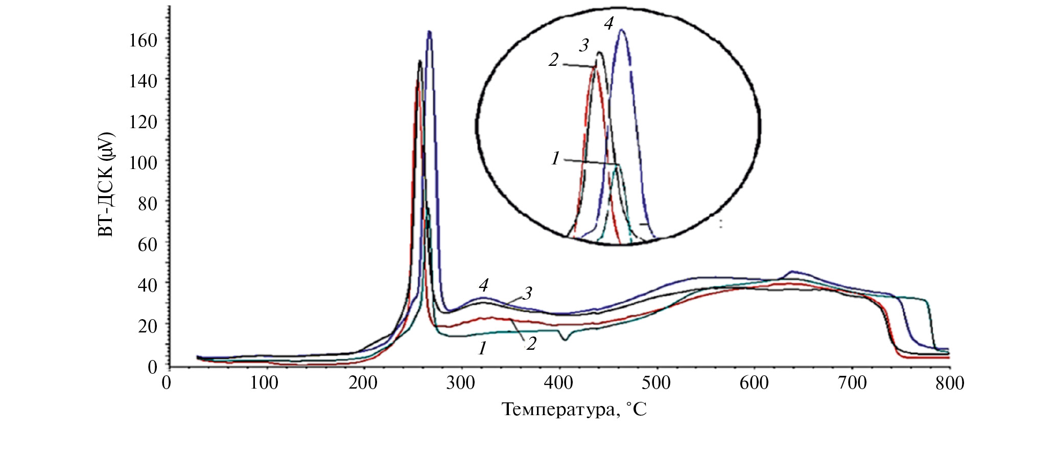 Термический анализ образцов выполняли на синхронном термоанализаторе “STA PT1600” (“LINSEIS”, Германия) методами термогравиметрии, дифференциальной термогравиметрии и дифференциальной сканирующий калориметрии. Измерения проводили воздушной атмосфере в динамическом режиме со скоростью нагревания 10оС/мин в интервале температур 25–800оС. На основе кривых термического анализа с помощью компьютерной программы Linseis TA Evaluation Software оценивали энтальпию плавления образцов.