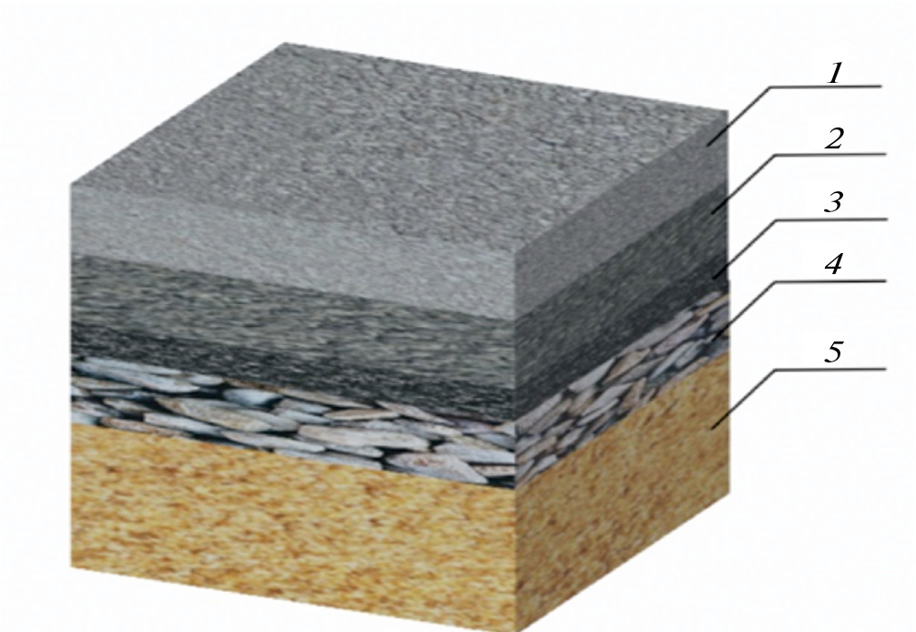 Рис. 1. Схема конструкции дорожной одежды: 1 – мелкозернистый асфальтобетон, 2 – крупнозернистый асфальтобетон, 3 – битумная пропитка, 4 – щебень, 5 – песок. Цветной рисунок можно посмотреть в электронной версии