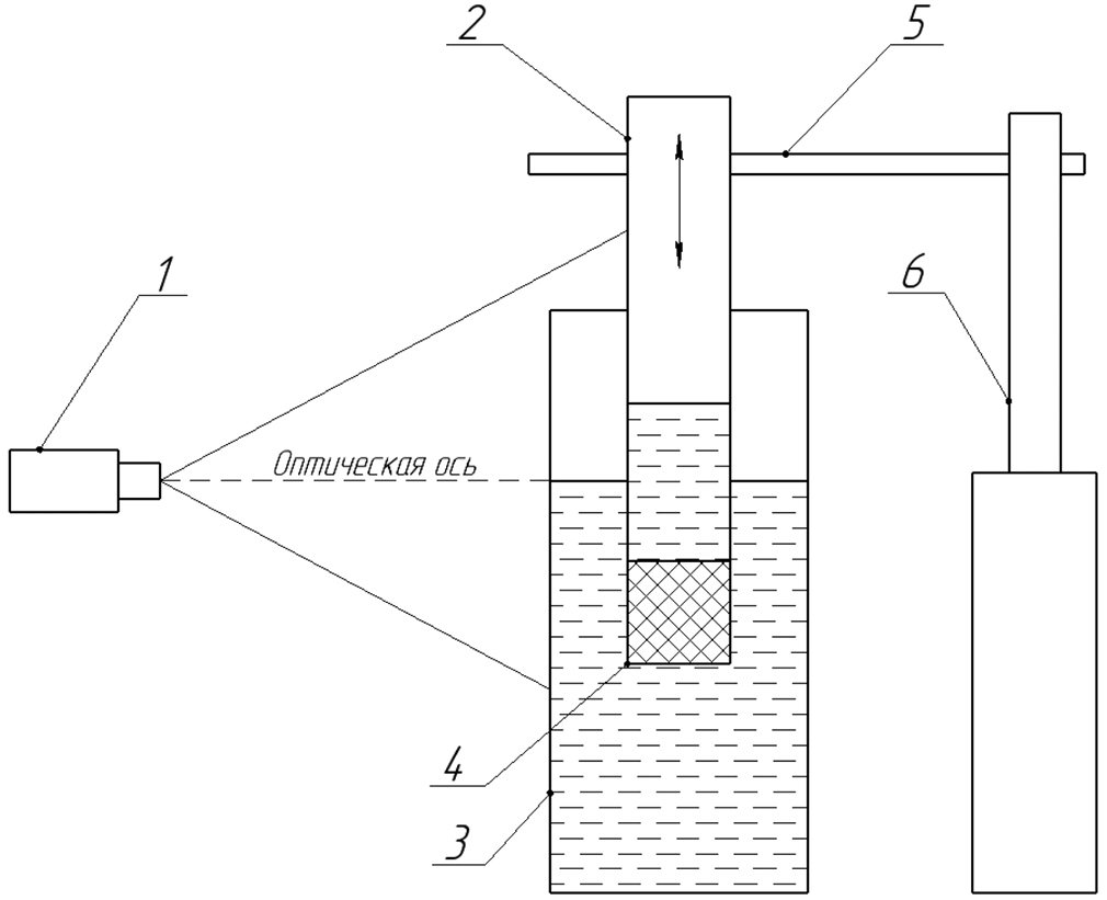 Исследование фильтрационных свойств проводили на специально сконструированной установке (схема установки показана ниже), состоящей из резервуара для жидкости (3), вертикальной прозрачной измерительной трубки (2), в нижней части которой закреплен переходник, соединяющий круглую измерительную трубку и измеряемый объект в виде куба (4). Переходник спроектирован и изготовлен на 3D-принтере под размер куба. Компоновка, включающая трубку, переходник и образец, закреплена на платформе (5), которая перемещается линейным приводом (6) в вертикальном направлении под действием электродвигателя. Контроль за перемещением платформы и положением мениска жидкости в измерительной трубке и резервуаре осуществляли посредством регистрации событий цифровой камерой (1):