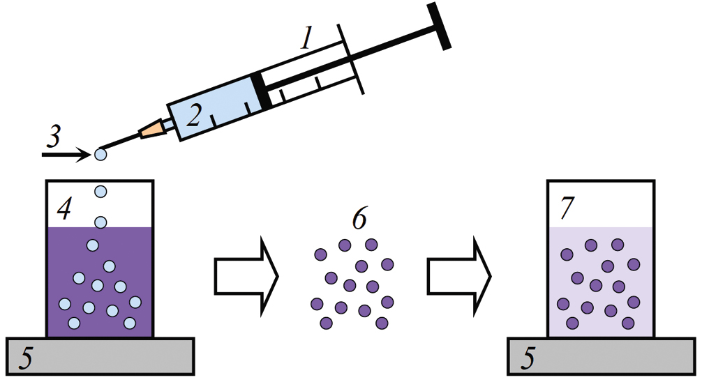 Рис. 1. Схема эксперимента: 1 – шприц, 2 – раствор альгината натрия, 3 – альгинатные микрокапли, 4 – емкость с гелеоразующим раствором МС(М), 5 – магнитная мешалка, 6 – гидрогелевые микросферы, 7 – емкость с промывочным раствором. Цветные рисунки можно посмотреть в электронной версии.