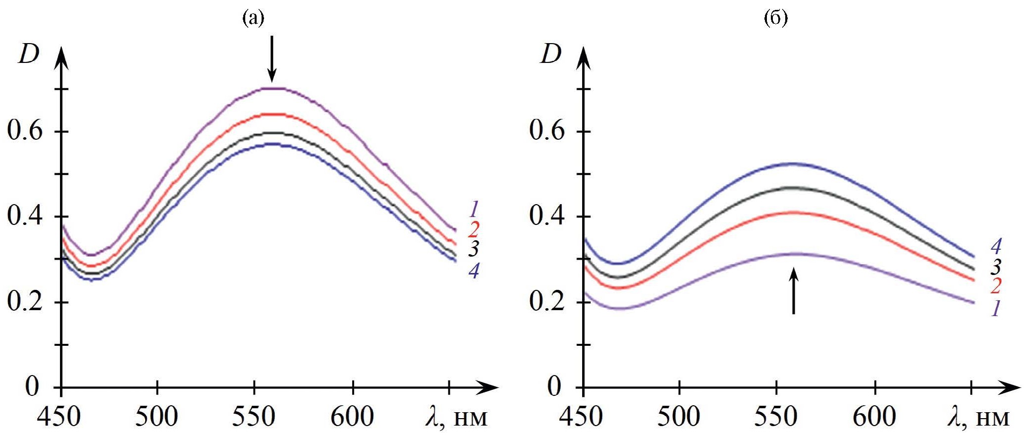Значения максимумов оптической плотности D для металлакраунов МС(Ca), МС(Sr) и МС(La) соответствуют длине волн λ = 550, 555 и 570 нм. На примере МС(Sr) приведены характерные изменения спектров поглощения проб гелеобразующего раствора в ходе желирования альгината (рис. 2а). Видно, что положение максимального значения оптической плотности не смещается, а само значение уменьшается, что свидетельствует о снижении содержания МС(М) в гелеобразующем растворе. При промывании полученных микросфер в дистиллированной воде значение D наоборот увеличивается, что свидетельствует о росте концентрации МС(М) в промывочном растворе (рис. 2б).