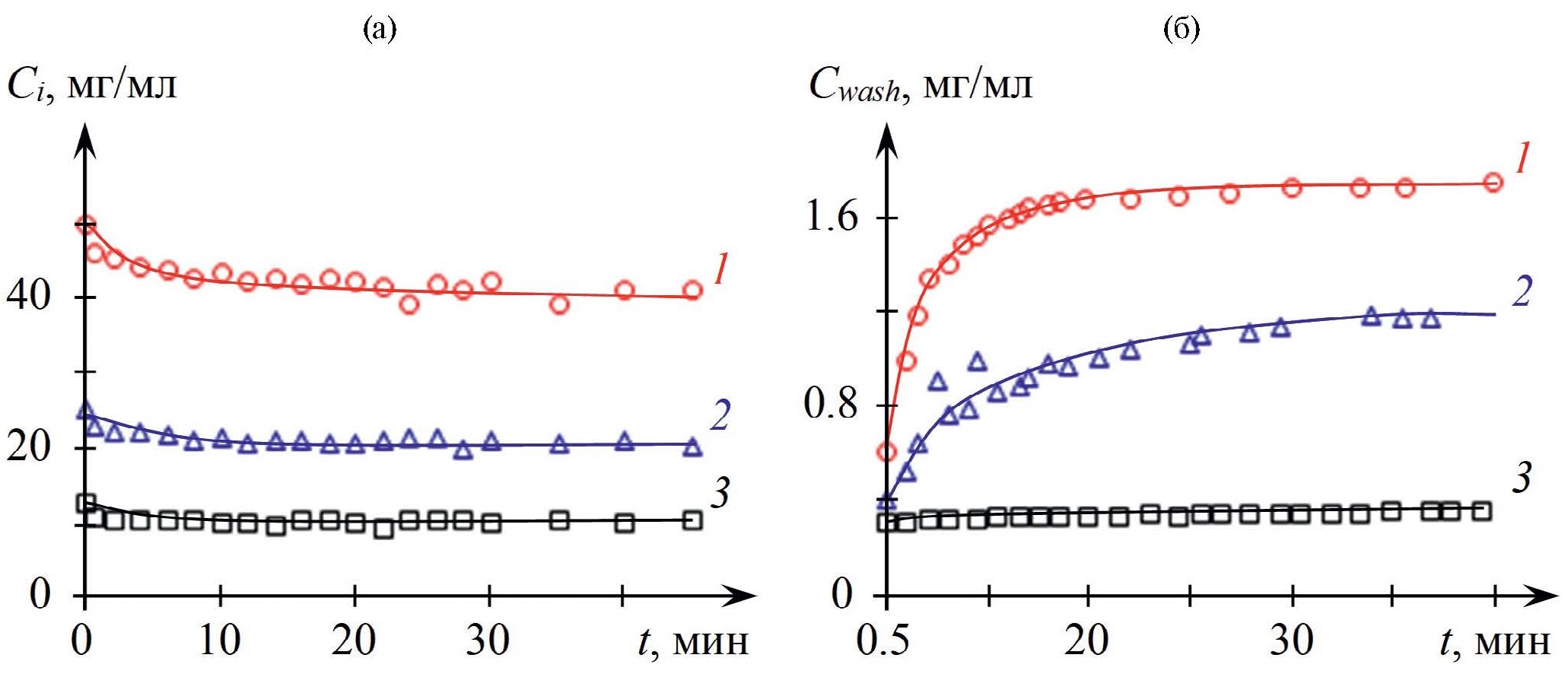 Рис. 3. Изменение концентраций МС(Ca) в пробах гелеобразующего раствора (Сi) (a) и в промывочном растворе (Сwash) (б). Концентрация МС(Ca) в исходных растворах 50 (1), 25 (2) и 12.5 мг/мл (3).