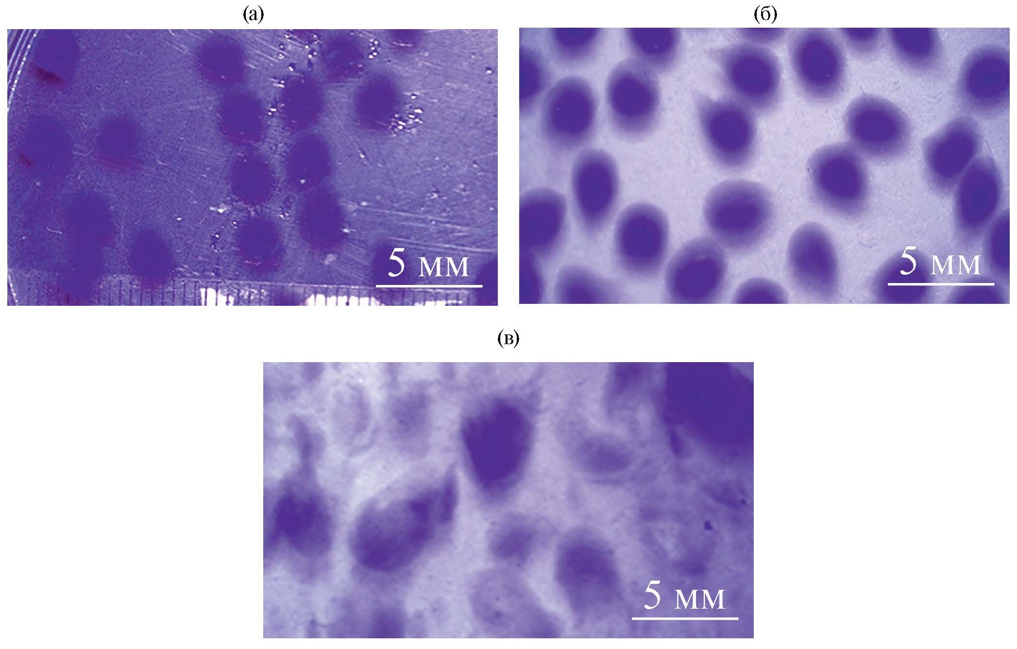 Замена центрального иона в структуре металлакрауна с Са(II) на Sr(II) не приводит к существенным изменениям в процессе образования гидрогелевых микросфер. Изменения концентраций МС(Sr) в гелеобразующих растворах наблюдаются в течение первых 10–15 мин, а затем они не меняются (рис. 5а). При исходных концентрациях С0(МС(Sr) 50 и 25 мг/мл получаются стабильные микросферы со средним диаметром 2.3 и 2.6 мм, соответственно (рис. 6а и 6б). При этом концентрация МС(Sr) в гелеобразующих растворах уменьшается с 50 до 41.8 мг/мл и с 25 до 20.4 мг/мл. После промывания сшитых микросфер в промывочном растворе устанавливаются следующие концентрации МС(Sr): Сwash(MC(Sr) = 1.0 мг/мл при сшивании альгината в растворе с C0(МС(Sr) = 50 мг/мл и Сwash(MC(Sr) = 0.8 мг/мл при C0(МС(Sr) = 25 мг/мл (рис. 5б). С умень шением концентрации МС(Sr) в гелеобразующем растворе до 12.5 мг/мл в ходе гелеобразования устанавливается концентрация Сend(МС(Sr) = 9.7 мг/мл, при этом, как и в случае использования раствора МС(Са) низкой концентрации, образуются бесформенные гидрогелевые образования (сгустки) (рис. 5в). При помещении последних в промывочный раствор там устанавливается концентрация 10 мг/мл (рис. 5б, кривая 3).