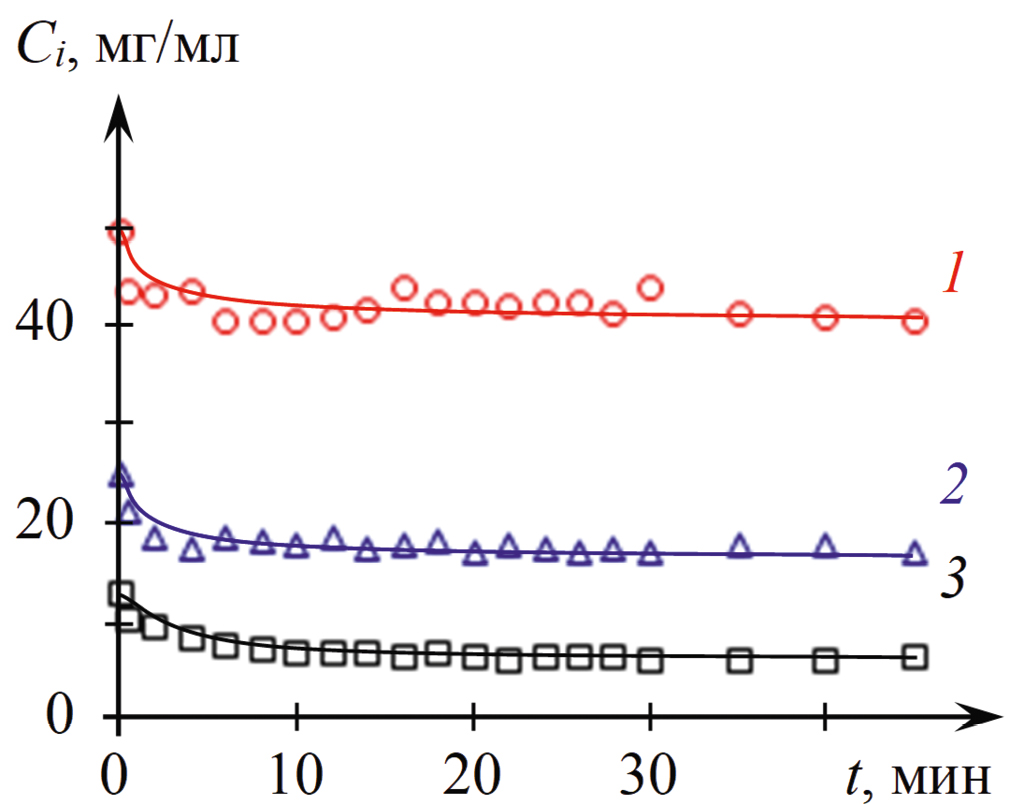 Рис. 7. Изменение концентраций МС(La) в пробах гелеобразующего раствора (Сi). Концентрация МС(La) в исходных растворах 50 (1), 25 (2) и 12.5 мг/мл (3).
