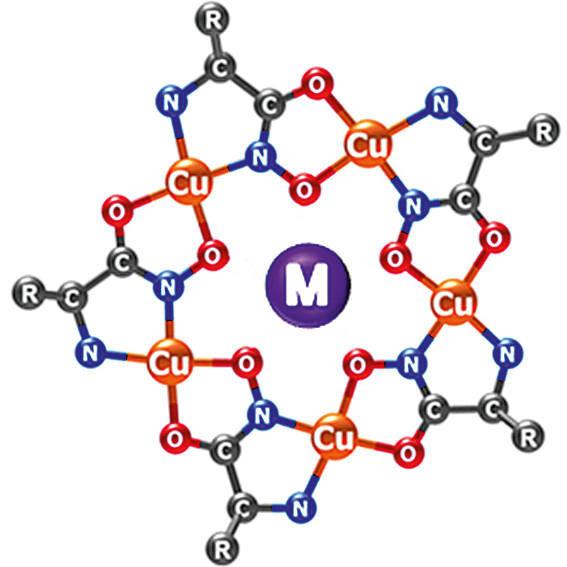 В рамках дальнейшего изучения применения ионов необычного строения несомненный интерес вызывают комплексные соединения, представляющие класс полиядерных аланингидроксиматных металламакроциклических соединений ‒ металлакраунов, структурно напоминающих краун-эфиры [38‒42], которые известны своим широким спектром биологической активности [43, 44]. Особенность их строения – наличие плоского металламакроцикла, состоящего из ионов меди(II) и аланингидроксиматных лигандов, а также координационно связанного центрального иона металла. Ниже приведена молекулярная структура металлакраунов: M = Ca(II), Sr(II), La(III).