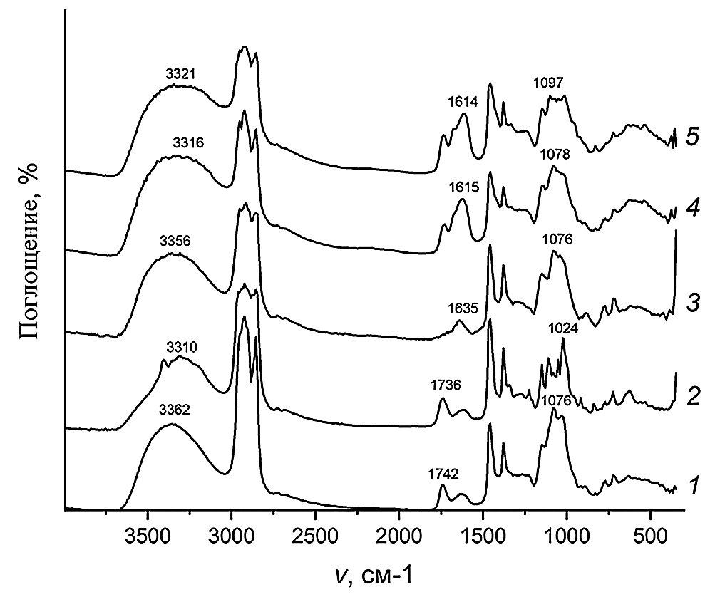 Рис. 1. ИК-спектры индивидуальных веществ и гидрогелей на их основе: 1 – пектин–арабиногалактан, 2 – пектин, 3 – арабиногалактан, 4 – пектин–Са2+, 5 – пектин–арабиногалактан–Са2+.