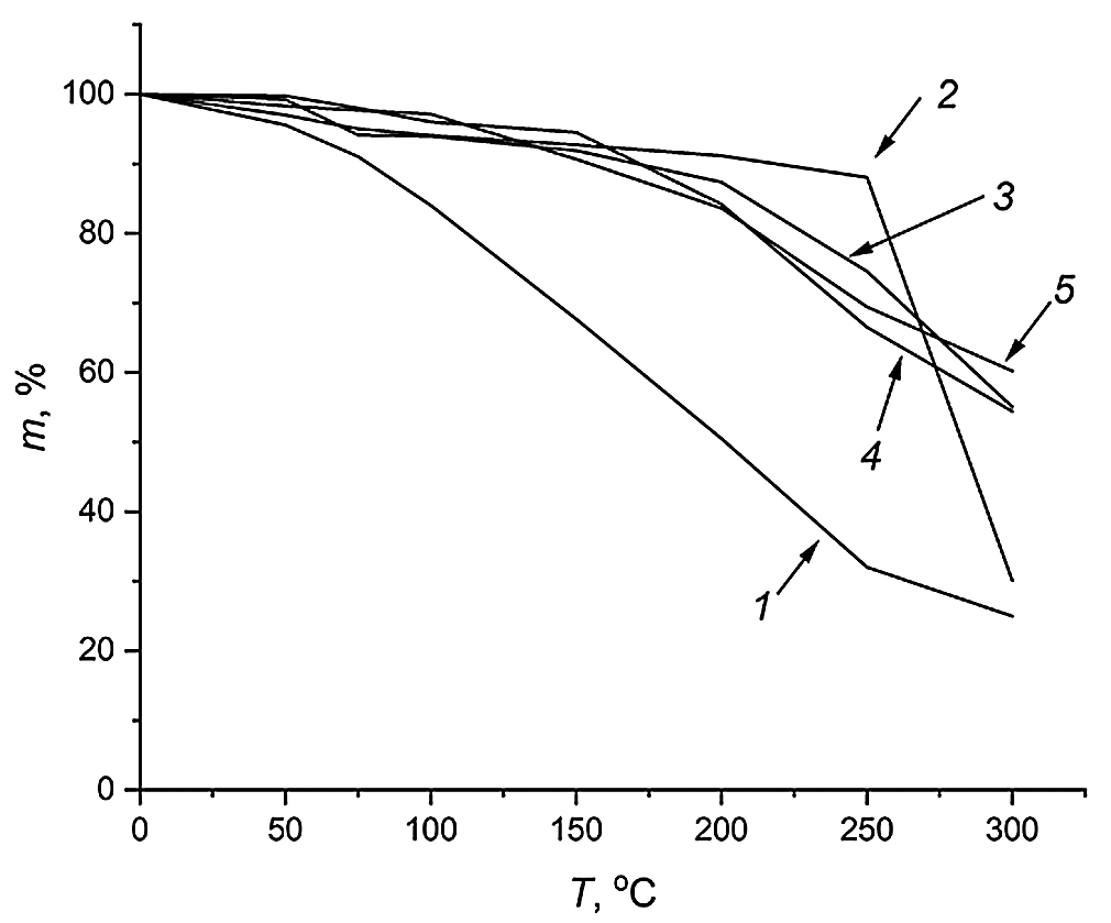 Рис. 3. Кривые ТГА индивидуальных полисахаридов пектина (1), арабиногалактана (2), пектин–арабиногалактан (3) и высушенных гидрогелей пектин–арабиногалактан–Ca2+ (4), пектин–Ca2+ (5).