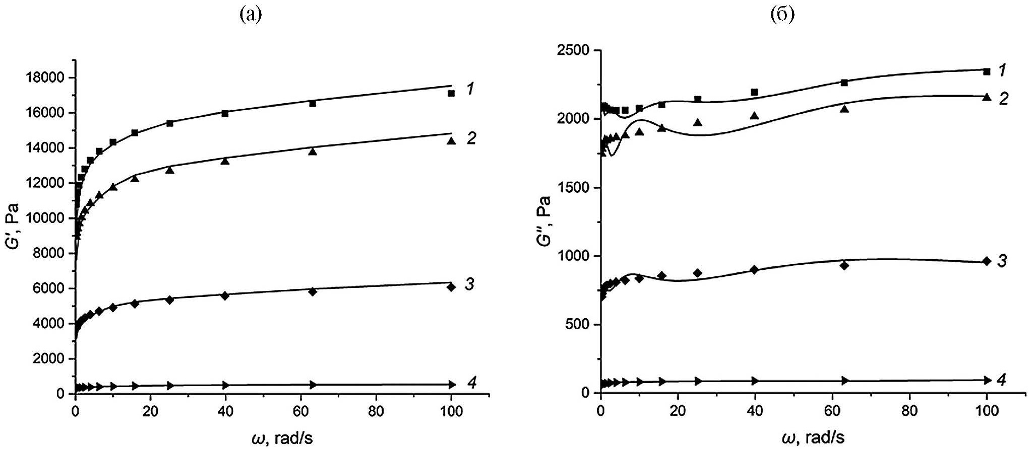 Рис. 4. Частотные зависимости модулей накопления G’ (а) и потерь G’’ (б) гелей пектина (1) и пектин–арабиногалактан–Са2+([Са2+] = 0.25 мас. %) состава 75 : 25 (2), 50 : 50 (3) и 25 : 75 об.% (4). Частота осциллирующего напряжения ω = 1 Гц, 25 °С. Точки – экспериментальные значения, линии – расчет в соответствии с обобщенной моделью Максвелла.