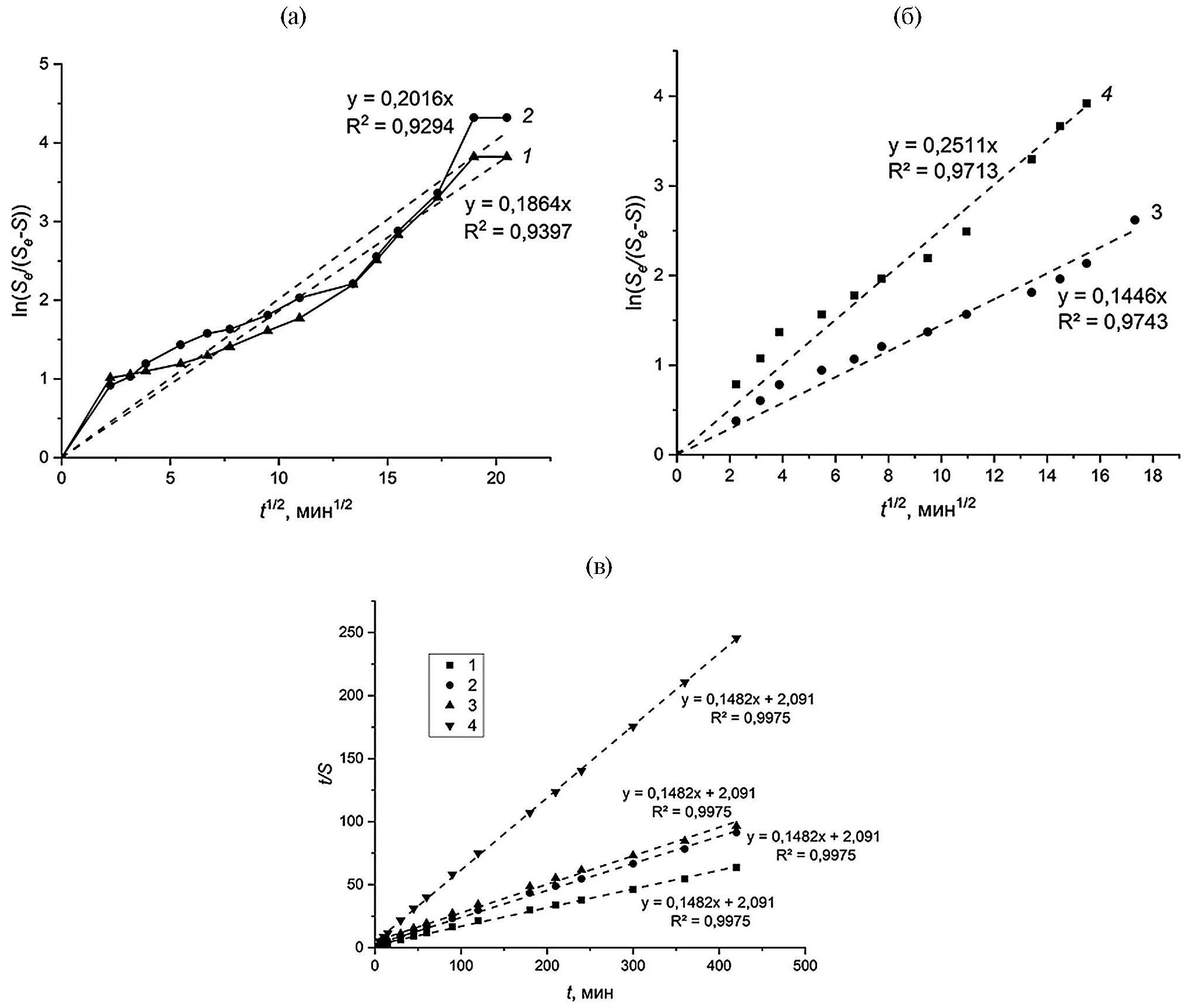 Рис. 6. Кинетические кривые набухания, обработанные в координатах уравнений (4) (а, б) и (5) (в) гелей пектин–Са2+ (1) и пектин–арабиногалактан–Са2+ ([Са2+] = 0.5 мас. %, рH 7.0) состава: 75 : 25 (2), 50 : 50 (3), 25 : 75 об.% (4). а: y = 0.1864x, R2 = 0.9397 (1); y = 0.2016x, R2 = 0.9294 (2); б: y = 0.1446x, R2 = 0.9743 (3); y = 0.2511x, R2 = 0.9713 (4); в: y = 0.1482x+2.091, R2 = 0.9975.