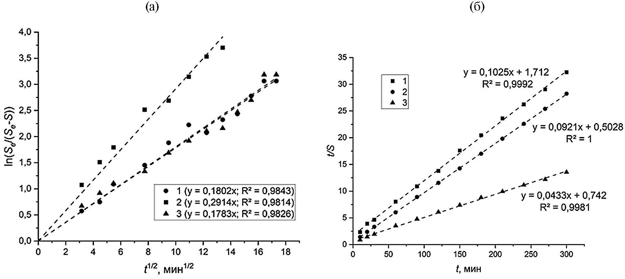 Экспериментальные кривые набухания полученных гидрогелей пектин–арабиногалактан–Са2+ анализировали в соответствии с линейными формами уравнений (2) и (3), которые описываются следующими выражениями;