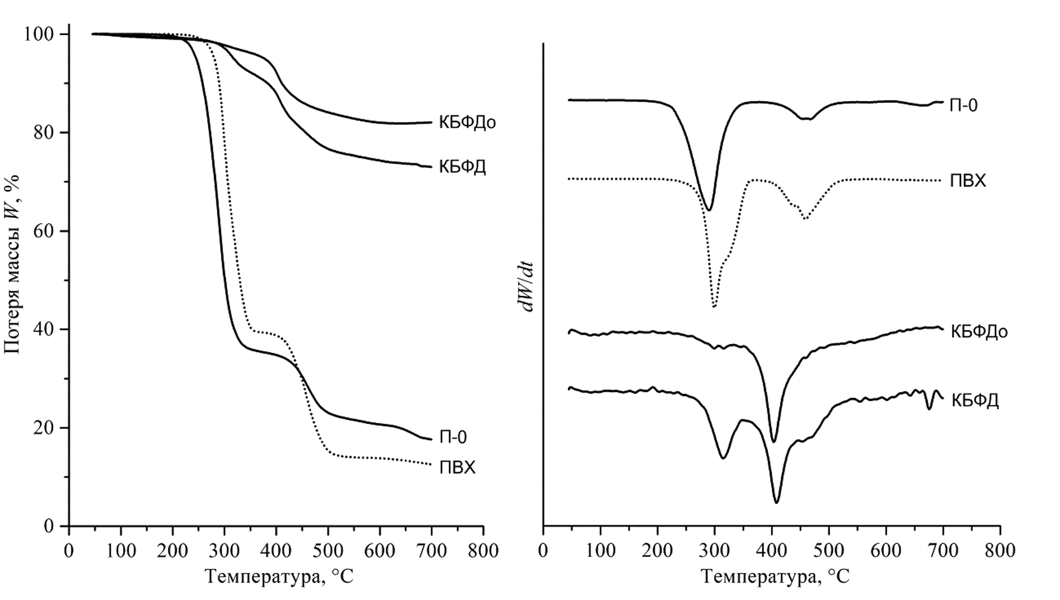 На дериватограммах непластифицированного ПВХ наблюдаются два максимума: потери массы при 270–400 °С соответствуют разложению ПВХ с выделением хлороводорода, а при 400–600 °С – деструкции образовавшейся полиацетиленовой цепи (в инертной атмосфере – до ненулевого коксового остатка). В пластифицированном ПВХ потеря пластификатора происходит в диапазоне 200–300 °С [22]. Разложение карбоната кальция (для наполненных мелом пластикатов) происходит при температурах 600–700 °С.