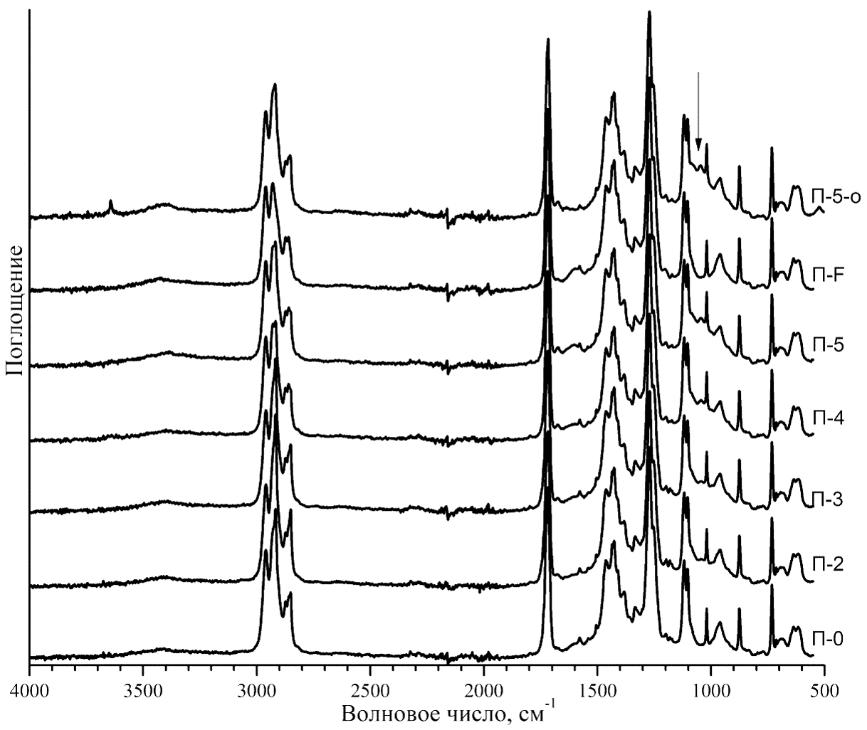 Экструзионным методом смешения в расплаве приготовлены ПВХ-пластикаты, содержащие 0, 2, 3, 4 и 5% КБФД (образцы П-0, П-2, П-3, П-4 и П-5 соответственно), а также пластикат, содержащий 5% промытой водой добавки КБФД(о) (образец П-5-о). Для сравнения использовали пластикат со стандартной биоцидной добавкой Fungitrol-11 (образец П-F). Спектры ИК-НПВО образцов пластикатов представлены на рис. 2.