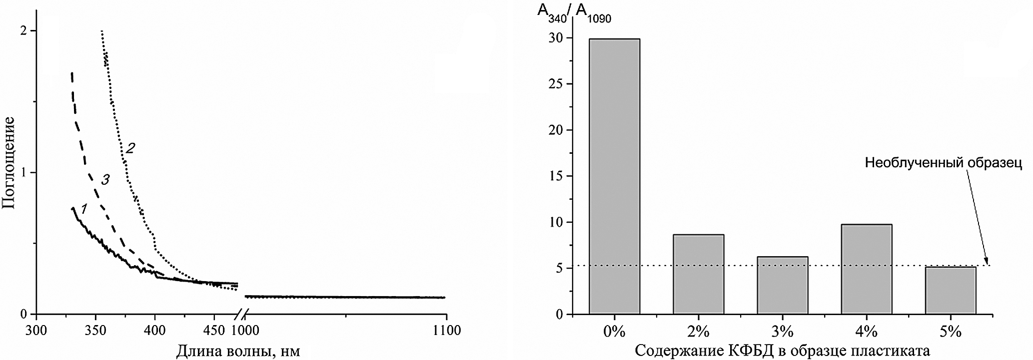 Рис. 3. Типичные УФ-спектры пленок ПВХ до облучения (1), после облучения (2) и пленок ПВХ + 4% КФБД после облучения (3) (а), а также соотношение интенсивностей поглощения A340/A1090 для облученных пленок с разным содержанием КБФД (гистограмма) и необлученного образца (б).
