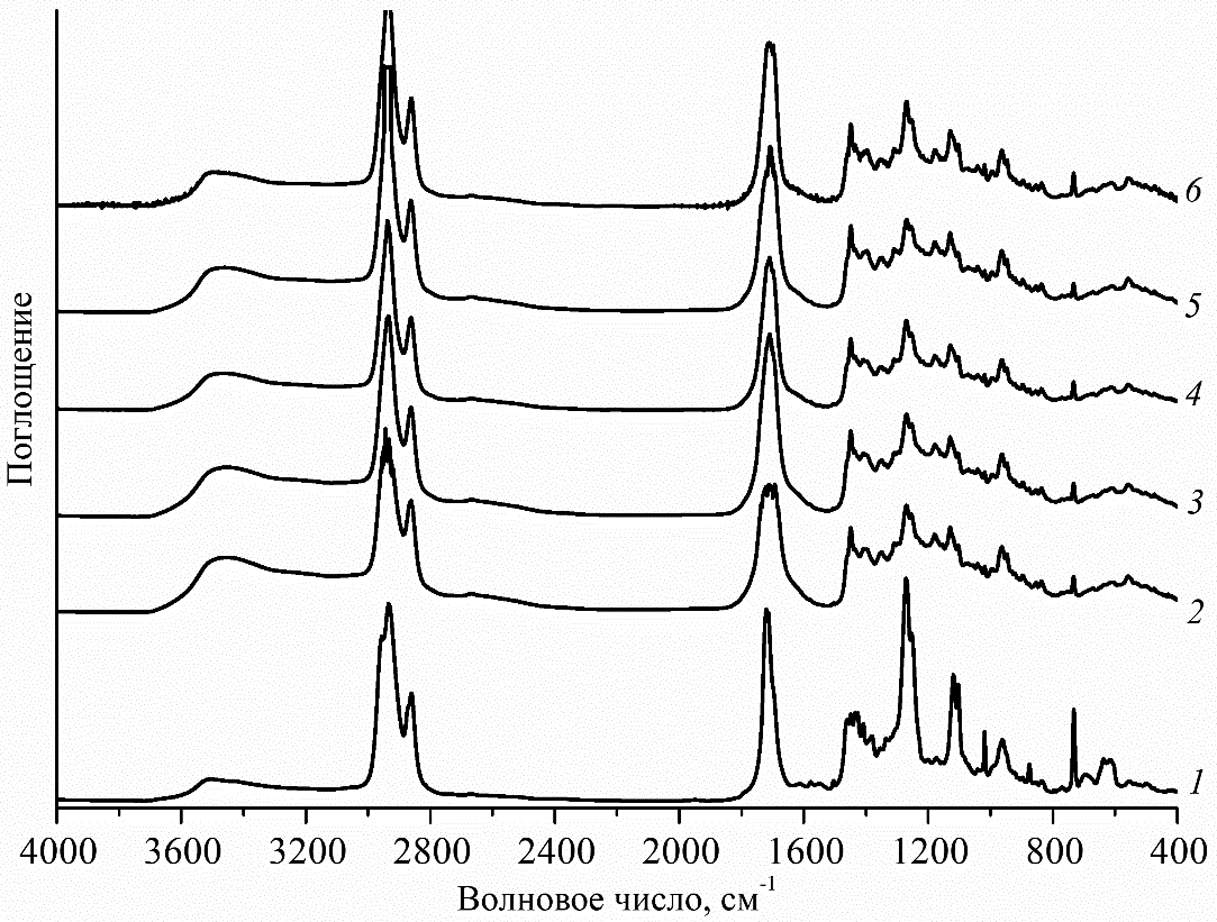 Рис. 4. ИК-спектры пропускания полимерной основы ПВХ-пластикатов до УФ-облучения (1) и после УФ-облучения при содержании КБФД в пластикате 0 (2), 2 (3), 3 (4), 4 (5) и 5% (6).