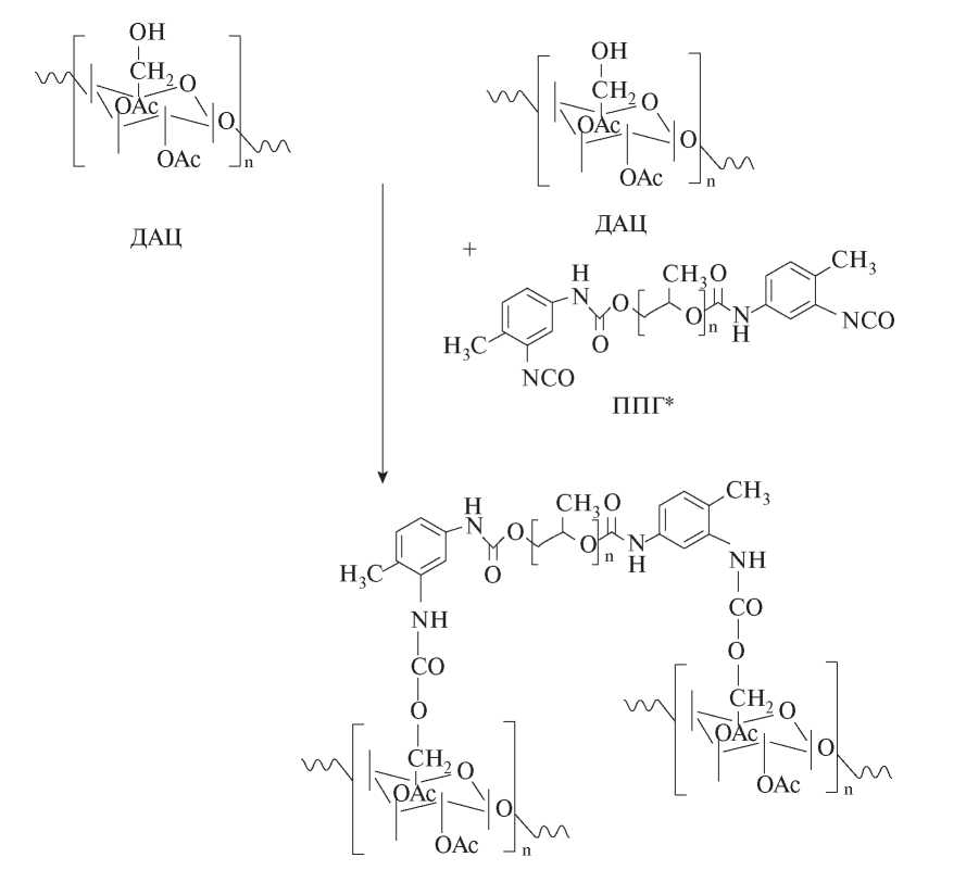 В отличие от работ, указанных выше, матрицей является эфир целлюлозы (ДАЦ), в раствор которого (в ДМАА) вводили раствор полипропиленгликоля с концевыми группами, замещенными 2,4-толуилендиизоцианатом (ППГ*) в том же растворителе. В ходе реакции протекает сшивка макромолекул эфира целлюлозы сшивающим реагентом с образованием уретановых связей.