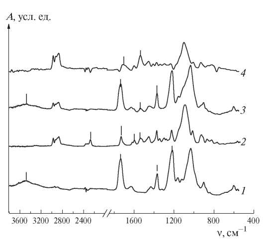Рис. 1. ИК-спектры ДАЦ (1), ППГ* (2), ДАЦ с 43% ППГ* (3) и спектр вычитания ДАЦ и ППГ* из пленки ДАЦ + 43% ППГ* (4).