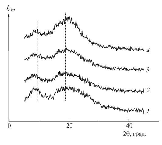 Рис. 2. Рентгенодифрактограммы пленок ДАЦ (1) и ДАЦ с ППГ* (2–4). Содержание ППГ* 13 (2), 28 (3) и 43 мас. % (4).