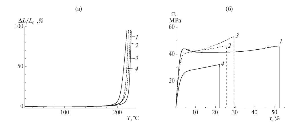 Рис. 3. Термомеханические (а) и деформационные (б) кривые пленок ДАЦ (1) и ДАЦ с ППГ* (2–4). Содержание ППГ* 13 (2), 28 (3) и 43 мас. % (4).