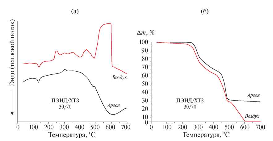 Рис. 3. Кривые ДСК (а) и ТГА (б) для образца ПЭНД/хитозан 30/70, полученные на воздухе и в аргоне.