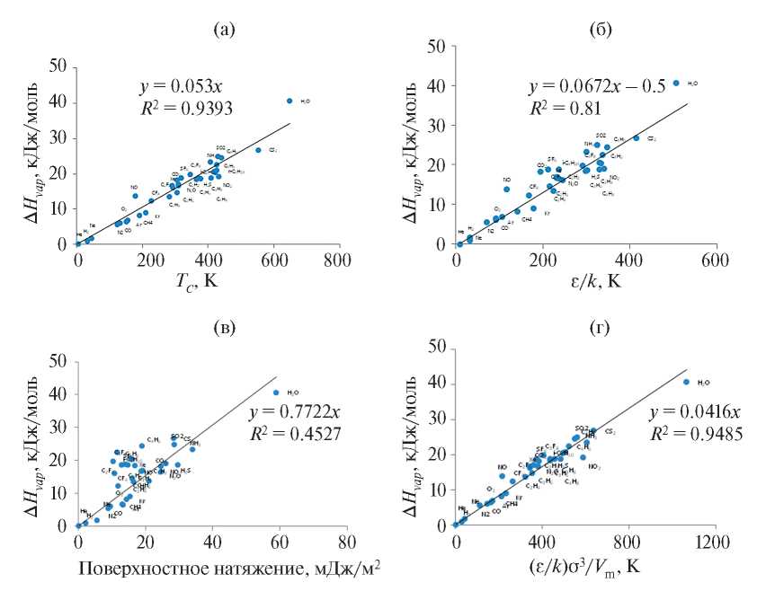 Рис. 5. Корреляция энтальпии испарения ΔHvap c критической температурой Tcr (а), параметром потенциала Леннард-Джонса (ε / k), поверхностным натяжением и инвариантом потенциала Леннард-Джонса (ε / k) σ3 / Vm для константных газов и легких паров. Для построения рисунков использованы (ε / k) рассчитанные по методике, приведенной в работе [58].