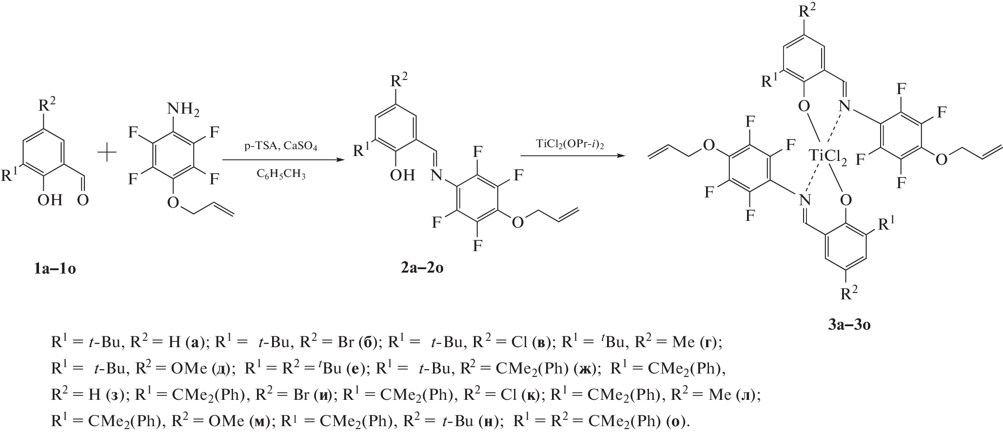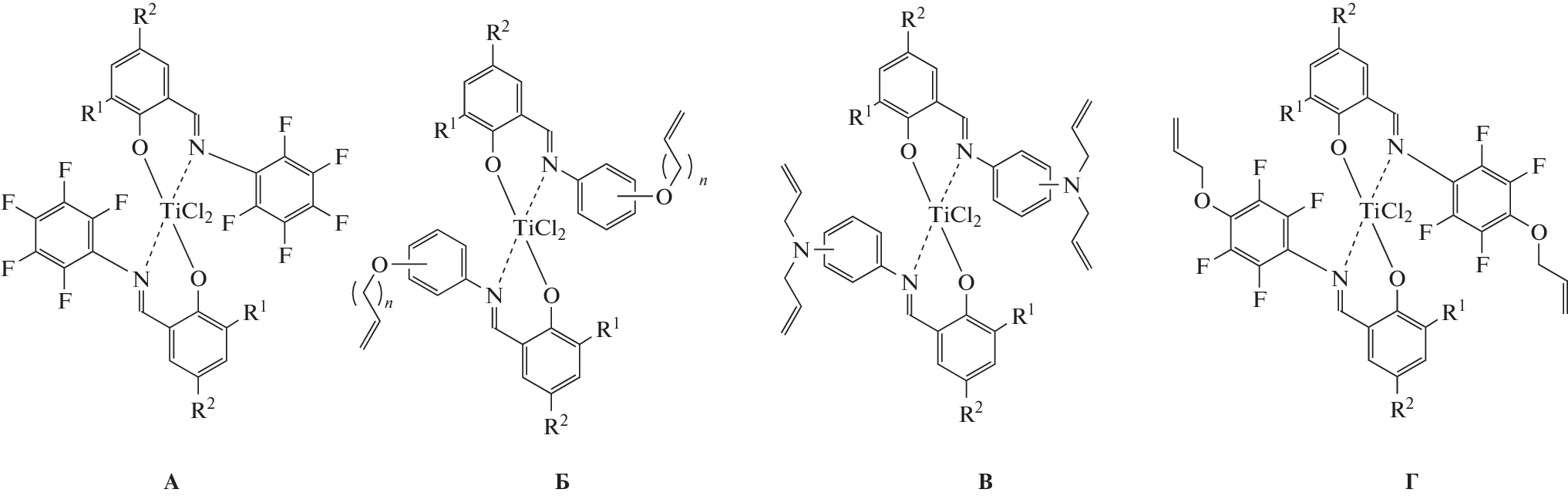 The features of ethylene polymerization in the presence of dichloridobis(salicylaldaryliminato)titanium(IV) complexes containing a 4-allyloxy-2,3,5,6-tetrafluorophenylimino group, namely, {2‑[(4-CH2=CH-CH2O)C6F4N=CH]-6-R1-4-R2-C6H2O}2TiCl2 (R1 = t-Bu, CMe2(Ph); R2 = H, Me, OMe, t-Bu, CMe2(Ph), Cl, Br) in the presence of methylalumoxane, have been studied. All the complexes exhibit high catalytic activity (27.8×106 гПЭ∙мольTi‐ 1∙МПаC2H4-1∙ч‐ 1)) in the temperature range of 10‒60°C and form powdered ultrahigh molecular weight polyethylene (UHMWPE) (M = (4.4–16.0) × 106 g/mol) with a low number of intermolecular entanglements. It has been shown that during polymerization, the complexes are immobilized on UHMWPE macromolecules.