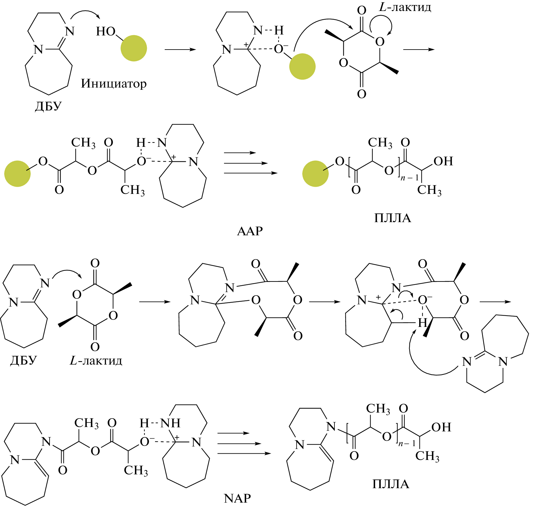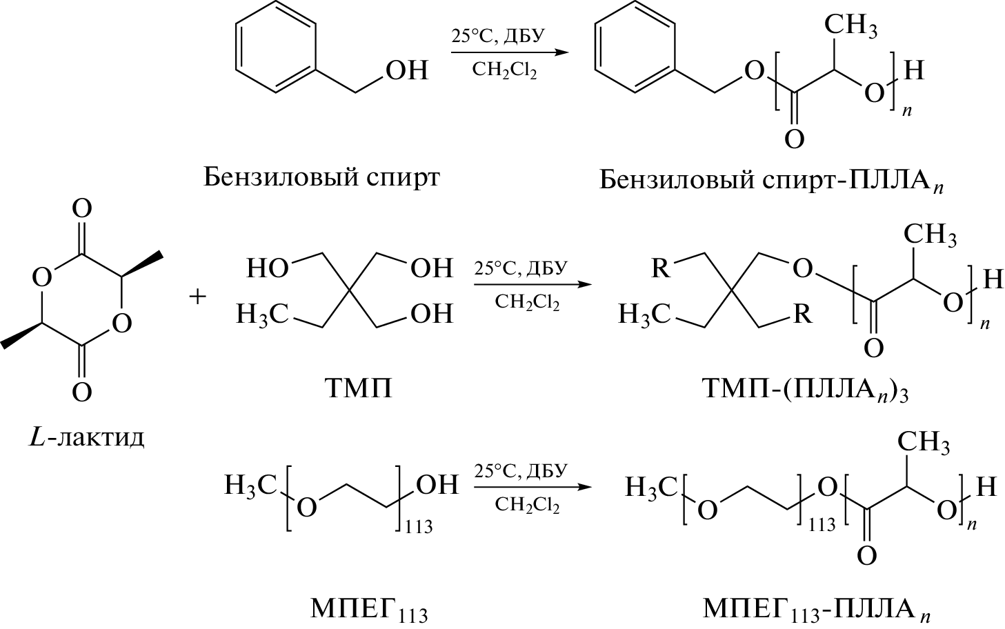 Исследован процесс полимеризации L-лактида под действием органического катализатора 1,8-диазабицикло[5.4.0]ундец-7-ена. Определены частные порядки реакции по мономеру и катализатору, рассчитана константа скорости полимеризации. Синтезированы перспективные для применения в медицине линейные поли-L-лактиды со среднемассовой молекулярной массой от 29 × 103 до 125 × 103 и индексом полидисперсности не выше 1.25. Показана возможность использования комбинации органокатализатора и гидроксилсодержащих инициаторов для синтеза звездообразного полилактида и амфифильного сополимера полилактид–блок–полиэтиленоксид.