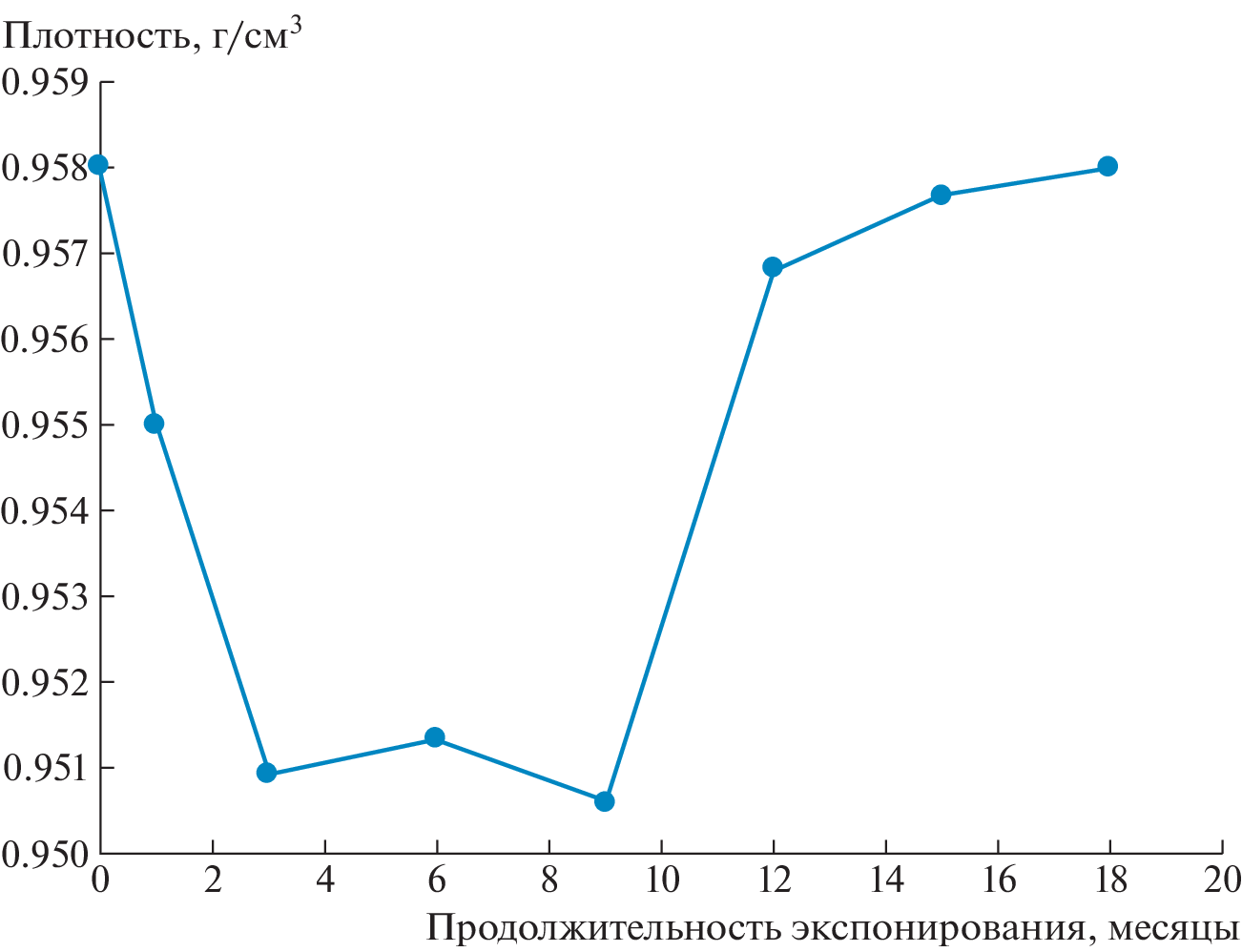 Условия эксплуатации изделий из полимерных материалов оказывают существенное влияние на срок их службы. В данной статье представлены результаты исследования продолжительности воздействия естественных климатических факторов Республики Саха (Якутия) (зона очень холодного климата) на структуру и свойства полиэтилена марки 273-83. С помощью метода ИК-спектроскопии установлено, что при продолжительном натурном экспонировании в материале протекают радикальные окислительные реакции, вызывающие снижение молекулярной массы полимера. Исследование показателя текучести расплава показало, что в полимере кроме реакций, сопровождающихся разрывом макромолекулярных цепей, протекают также процессы сшивания. Оба процесса приводят к снижению молекулярной массы полимера и расширению молекулярно-массового распределения. Изменение степени кристалличности и размеров ламелярных образований имеет немонотонный характер и определяется метеоусловиями в период экспонирования. Изменения интенсивности солнечного излучения, а также среднесуточных и сезонных температур окружающего воздуха в совокупности с химическими изменениями, протекающими в полимере при натурном экспонировании, приводят к появлению областей упорядоченных структур в аморфной фазе, в результате чего толщина аморфного пространства, обусловливающего пластичность материала, снижается. При этом напряжения в макромолекулярных цепях полимера, находящихся в аморфной фазе повышаются настолько, что полимер демонстрирует поведение хрупкого материала.