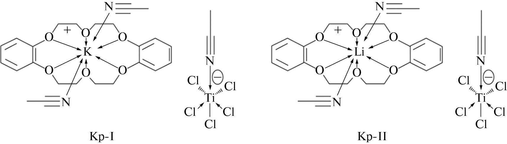 Ионные комплексы получали реакцией LiCl или KCl с TiCl4 в присутствии одного эквивалента ди-бензо-18-краун-6 в безводном ацетонитриле согласно [3, 4]. Состав и кристаллическая структура комплексов определены методами элементного анализа, ЯМР, MALDI MS-спектроскопии и рентгеноструктурным анализом [4].