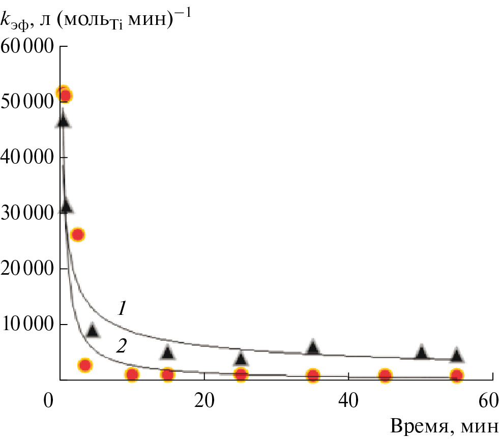 Скорость реакции оценивали по эффективной константе скорости полимеризации kэф = = Rпол(СЭ × СTi)–1 [л(мольTi мин)–1], где Rпол – скорость полимеризации, моль/(л мин) , СЭ и СTi – концентрации этилена и комплекса, моль/л.