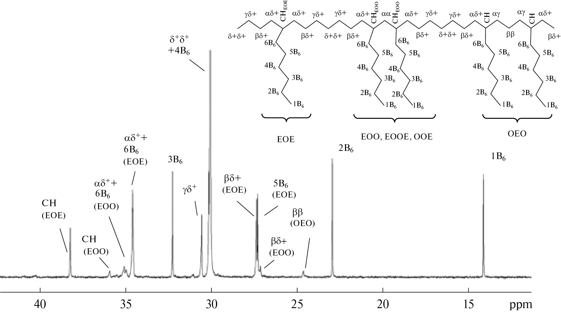 На рис. 2 приведен спектр ЯМР 13С сополимера этилен–октен-1 с COсопол = 9.0 мол. %, полученного на Кр-II, и даны отнесения сигналов различных последовательностей.