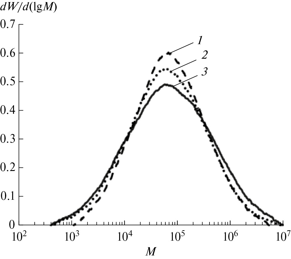 ММ и ММР полимеров измеряли при 160°С на приборе “PL-220”, снабженном колонками PL-gel Olexis, рефрактометром и дифференциальным вискозиметром. Растворителем служил 1.2.4-трихлорбензол, скорость элюирования составляла 1 мл/мин. Среднюю молекулярную массу продуктов рассчитывали по универсальной калибровочной кривой с использованием ПСи ПЭ-стандартов с узким ММР в диапазоне молекулярных масс 750–(1.3 × 107). Параметры уравнения Марка–Хаувинка для ПЭ: К = 6.14 × 10–4, α = 0.67; для ПС: К = 2.80 × 10‒4, α = 0.64.