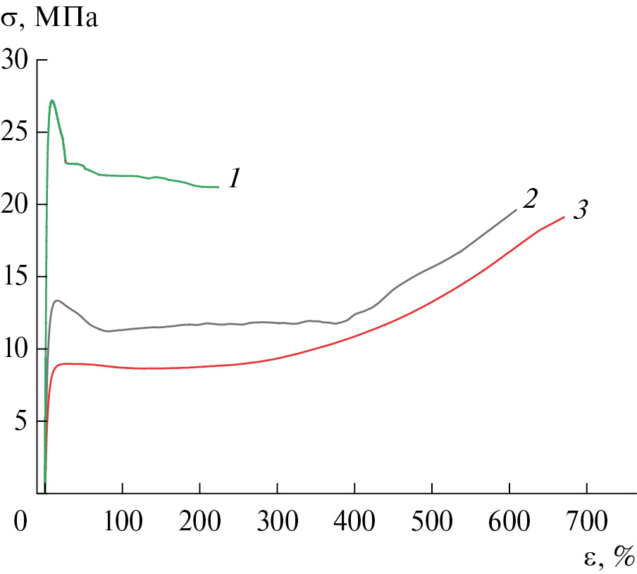 Рис. 6. Деформационные кривые ПЭ (1) и сополимеров этилен–октен-1 с COсопол = 2.0 (2) и 3.9 мол. % (3), полученных с Кр-I.