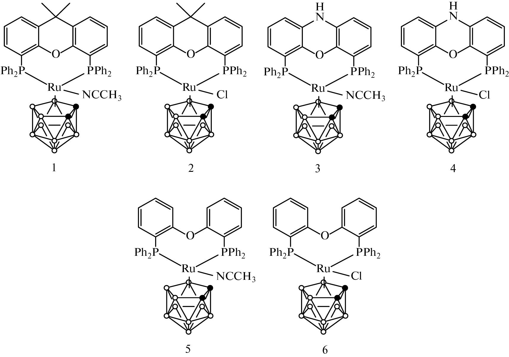 Комплексы 1 и 2, содержащие в своей структуре лиганд XantPhos, отличаются друг от друга наличием ацетонитрильного или хлорного лиганда. Соответственно в комплексе 1 атом рутения находится в формальной степени окисления +2, тогда как комплекс 2 является соединением трехвалентного металла.