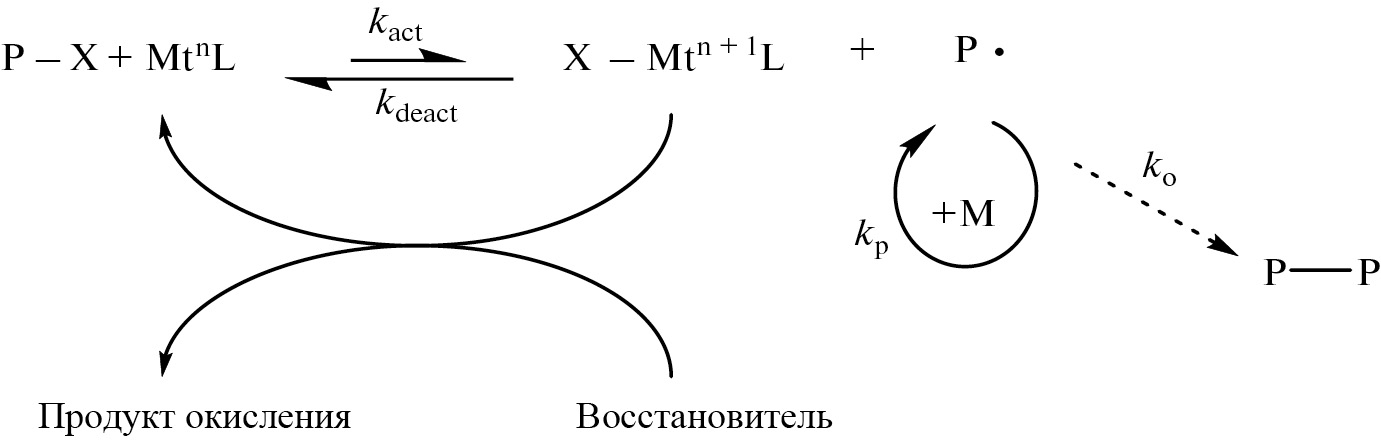 Радикальная природа полимеризации неизбежно ведет к протеканию побочного процесса квадратичного обрыва цепей. Его следствием является накопление в системе комплекса металла в высшей степени окисления, что в свою очередь ведет к снижению скорости реинициирования и увеличению скорости обратимого обрыва. На практике это приводит к замедлению процесса вплоть до его полного затухания [22]. Добавление восстанавливающего агента позволяет компенсировать выход катализатора из реакции и за счет этого проводить процесс при его низких концентрациях, что позволяет рассматривать данный метод в соответствии с концепцией “зеленой” химии.