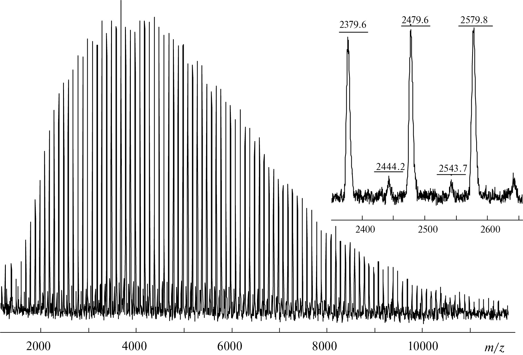 Рис. 1. МАЛДИ масс-спектр ПММА, полученного в присутствии каталитической системы на основе комплекса 2 при 80°С. [MMA] : [CCl4] : [Ru] : [i-PrNH2] = 10000 : 25 : 1 : 40. Матрица – DCTB, ионизирующий агент – трифторацетат натрия.