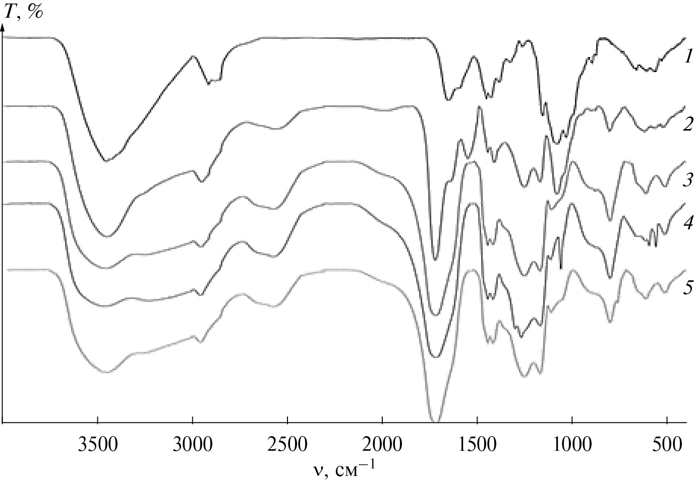 Рис. 5. ИК-Фурье-спектры хитозана из панциря краба (1) и сополимера хитозан : акриловая кислота (2–5): 2 – [акриловая кислота] = 1.25 моль/л, [хитозан] = 4.43 × 10–3 осново-моль/л, [I] = 6.5 × 10–3 моль/л; 3 – [акриловая кислота] = 1.25 моль/л, [хитозан] = 1.33 × 10–2 осново-моль/л, [I] = 6.5 × 10–3 моль/л; 4 – [акриловая кислота] = 1.25 моль/л, [хитозан] = 2.48 × 10–2 осново-моль/л, [I] = 6.5 × 10–3 моль/л; 5 – [акриловая кислота] = 0.29 моль/л, [хитозан] = 1.24 × 10–2 осново-моль/л, [I] = 1.0 × 10–3 моль/л.