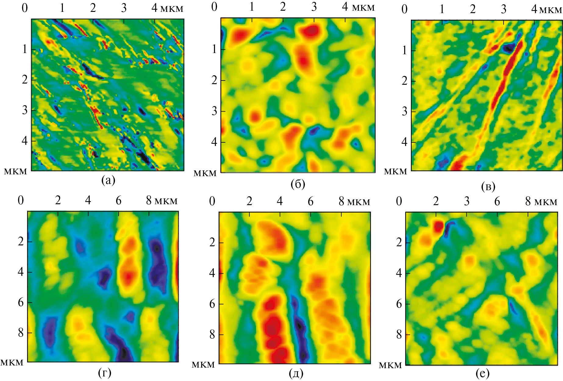 Рис. 6. Изображения поверхностей образцов привитых сополимеров (а–в) и полимерных смесей (г–е) хитозана и акриловой кислоты. Мольное соотношение хитозан : акриловая кислота = 1.33 × 10–3 : 1.25 (а, г), 2.48 × 10–2 : 1.25 (б, д), 4.43 × 10–3 : 1.25 (в, е).