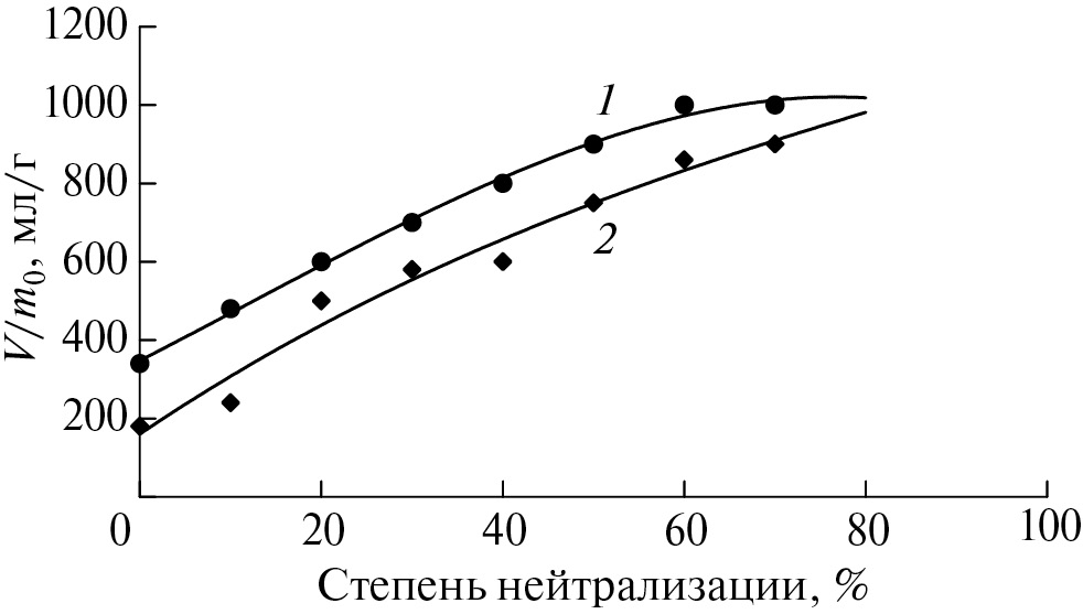 Рис. 8. Зависимость изменения объема V на единицу массы m0 привитых сополимеров в воде от степени нейтрализации карбоксильных групп. Условия синтеза: [акриловая кислота] = 4.86 моль/л, [персульфат калия] = 1 × 10–2 моль/л, Т = 50°C; [хитозан] = 9.93 × 10–3 (1) и 19.8 × 10–3 осново-моль/л (2).