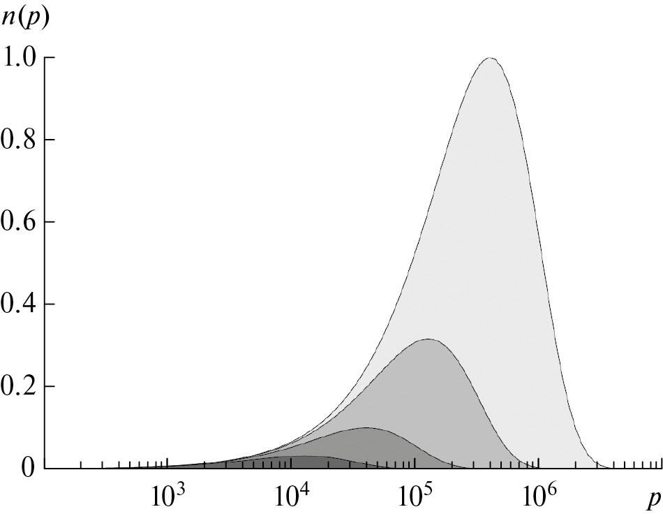 Эта возможность обусловлена тем, что описывающие ММР функции ƒ(p) должны быть определены на интервале 1 ≤ p ≤ N, где N – суммарное количество образующих полимер мономеров, и могут быть связаны с конверсией мономера. По условию нормировки и из определения среднечисленной степени полимеризации следует, что величина pn является в общем случае функцией N. В приложении к аэрозолям данная проблема особенно принципиальна, так как количество нелетучего мономера в капле аэрозоля ограничено, а предположение о постоянной концентрации мономера, использованное в работе [18], не выполняется.