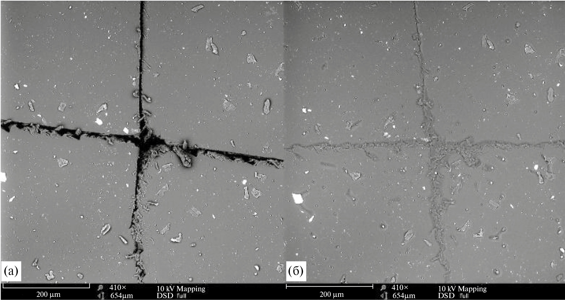 Рис. 8. СЭМ-изображения образца пленки ПУ-ТФ3 до (а) и после (б) проведения термического залечивания.