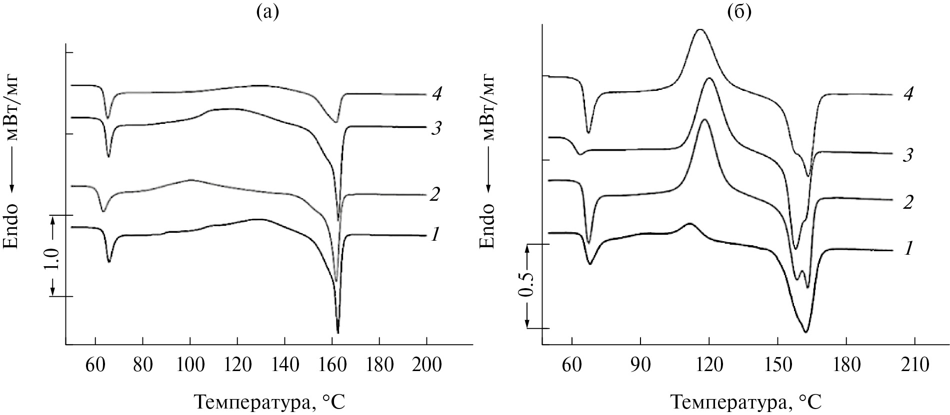 Рис. 4. ДСК-кривые композиций полилактид–ВОГ, полученных в растворе хлороформа, содержащих 0.05 (1), 0.1 (2), 0.25 (3), 1.0 мас. % ВОГ (4) (а), а также в условиях твердофазного смешения для исходного полилактида (1) и композиций полилактид–ВОГ, содержащих 0.05 (2), 0.15 (3), 0.5 мас. % ВОГ (4) (б), при первичном нагревании [78].