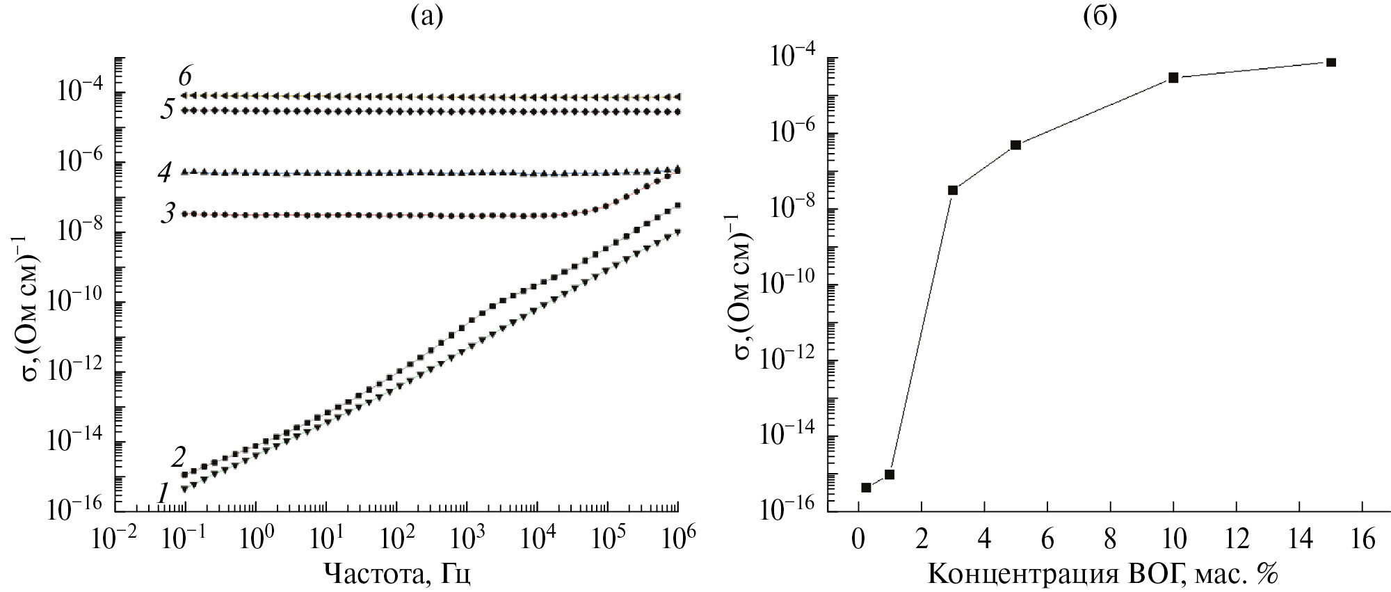 Рис. 9. Зависимость проводимости s от частоты при концентрациях ВОГ 0.25 (1), 1.0 (2), 3.0 (3), 5.0 (4), 10.0 (5), 15.0 мас. % (6) (а) и на низких частотах от концентрации ВОГ (б) композиций, полученных жидкофазным способом [78].