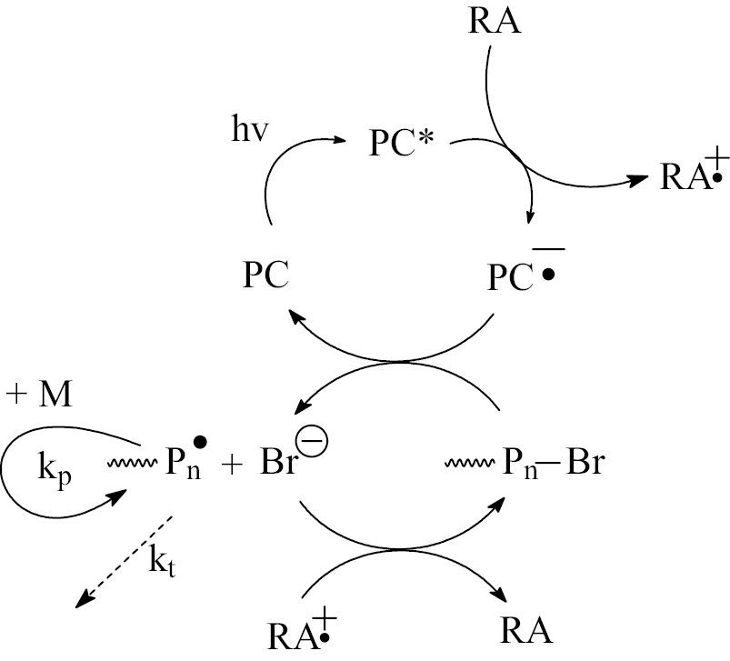 где PC – фотокатализатор, ~Pn–Br – “спящая” цепь, RA – донор электронов.