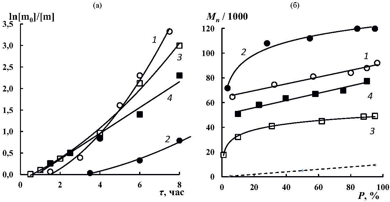 На рис. 1а представлены зависимости выхода ПММА от времени при синтезе полимеров с использованием каталитических композиций феназин + EBiB и феназин + EBiB + Bu3N в полулогарифмических координатах. Установлено, что в условиях дегазации реакционной среды при инициировании полимеризации системой феназин + EBiB наблюдается индукционный период (рис. 1а, кривая 1), однако по его истечении процесс протекает до высокой конверсии (> 95%). В отсутствие дегазации реакционной смеси и период индукции, и время достижения глубоких степеней превращения увеличиваются (рис. 1а, кривая 2). При использовании для инициирования полимеризации тройной композиции феназин + EBiB + Bu3N на начальном этапе наблюдается увеличение выхода ПММА относительно процесса без амина вне зависимости от наличия или отсутствия кислорода в реакционной среде (рис. 1а, кривые 3, 4). Период индукции при этом практически исчезает.