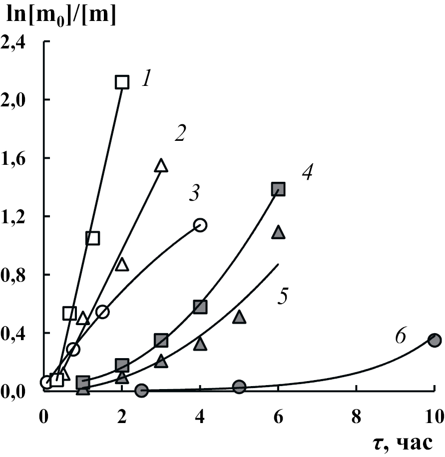 Рис. 2. Зависимость ln(m0/m) ММА от времени облучения. Облучение светом с λмакс ~ 365 нм; объемное соотношение ММА : ДМСО = 1 : 1; инициатор CBr4 (1–3) и t-BuBr (4–6); мольное соотношение ММА : инициатор : феназин : Bu3N = 100 : 1 : 0.01 : 0.5 (1–4), 100 : 1 : 0.01 : 0 (2, 5), 100 : 1 : 0.01 : 0; дегазация: 1–3 – есть; 4–6 – нет